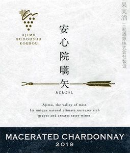 矢の先端に音が出る「鏑(かぶら)」を付けたものを「嚆矢(こうし)」と呼び、物事を始める合図として利用されていますが、安心院葡萄酒工房では、初めて栽培する品種や仕込みで造る新たなワインに「安心院嚆矢」と名付け、そのチャレンジ精神を様々な味わいで表現しています。今回の一本は、白葡萄のシャルドネを、赤ワインの製造と同じように果皮浸漬(マセレーション)して造る、限定醸造ワインとなります。